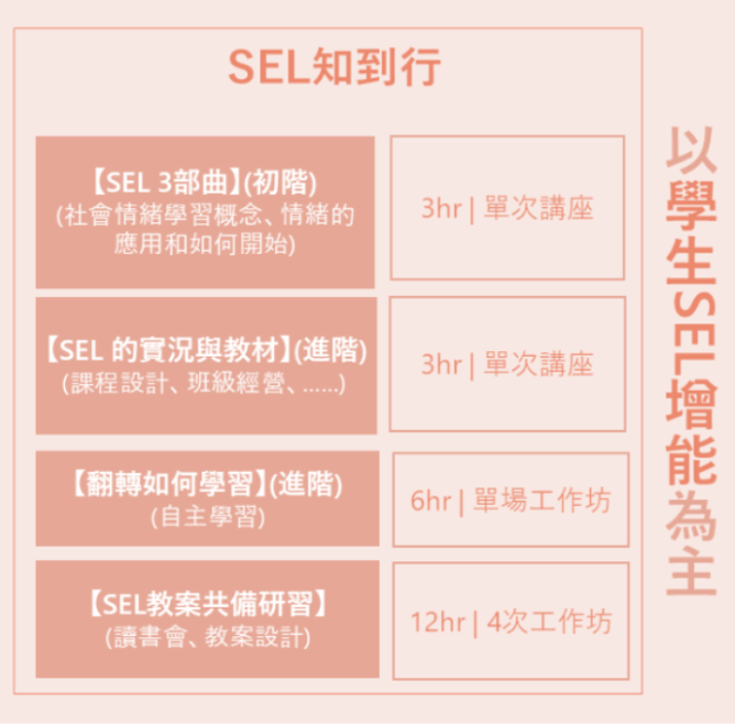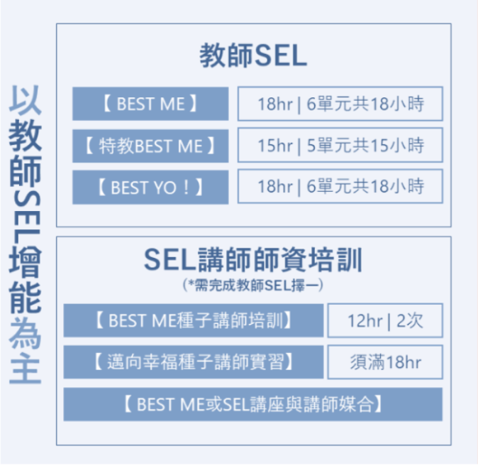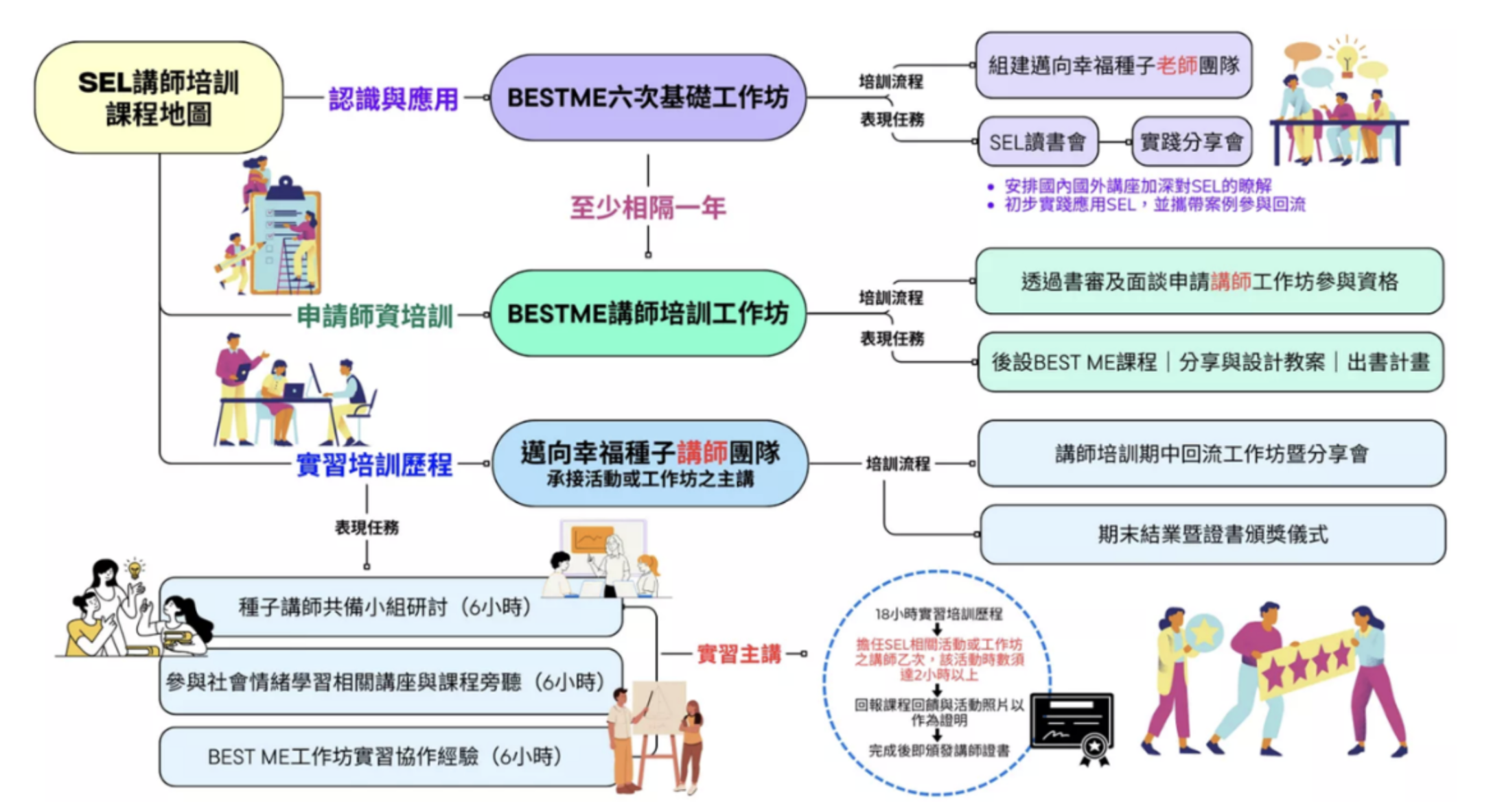 第一階段是參加「BEST ME」的初階課程(每周3小時課程,共6週,另有課後練習、團隊協作、助教輔導等);第二階段是經過一年的實踐體驗,參加「BEST ME種子講師培訓」(兩日整日);第三階段是「邁向幸福種子講師實習」(包含18+2小時的培訓歷程)。