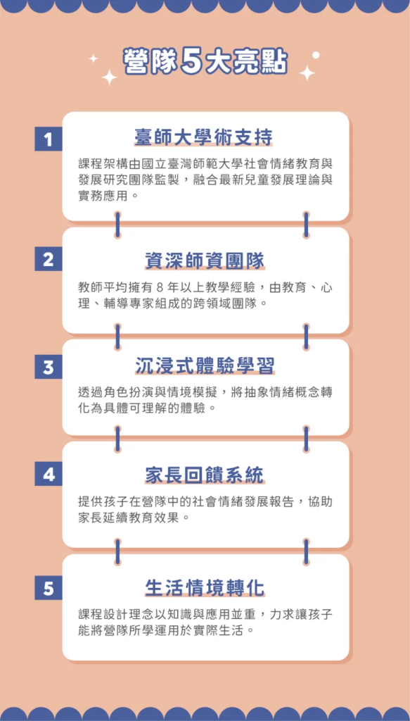 第本中心於寒暑假舉辦社會情緒營隊,透過系統化的社會情緒學習課程,引導兒童在遊戲、團隊合作與創意活動中,發展情緒認知、同理心、有效溝通、自我管理及問題解決等核心能力。營隊設計結合趣味與教育,並提供安全、支持的學習環境,讓孩子在參與過程中培養自信與責任感,增進人際連結,為日常生活與未來學習奠定穩固基礎。
